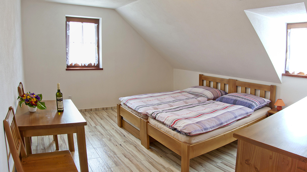 Penzion Krajní řádek nabízí ubytování ve vinařském domě v pěti dvoulůžkových a v jednom čtyřlůžkovém pokoji (rodinná dovolená Perná a okolí). V každém pokoji je možnost kvalitní přistýlky, která se dá zasunout pod postele (komfortní ubytování v penzionu Perná). Jedna část penzionu má čtyři pokoje, každý s vlastním sociálním zařízením. Kuchyňka je společná. V druhé části penzionu jsou dva pokoje (jeden čtyřlůžkový, druhý třílůžkový) každý s vlastním sociální zařízením. Tyto pokoje mají společnou kuchyňku s jídelnou. Na pokojích je wi-fi připojení (ubytování s wi-fi připojením Perná a okolí).