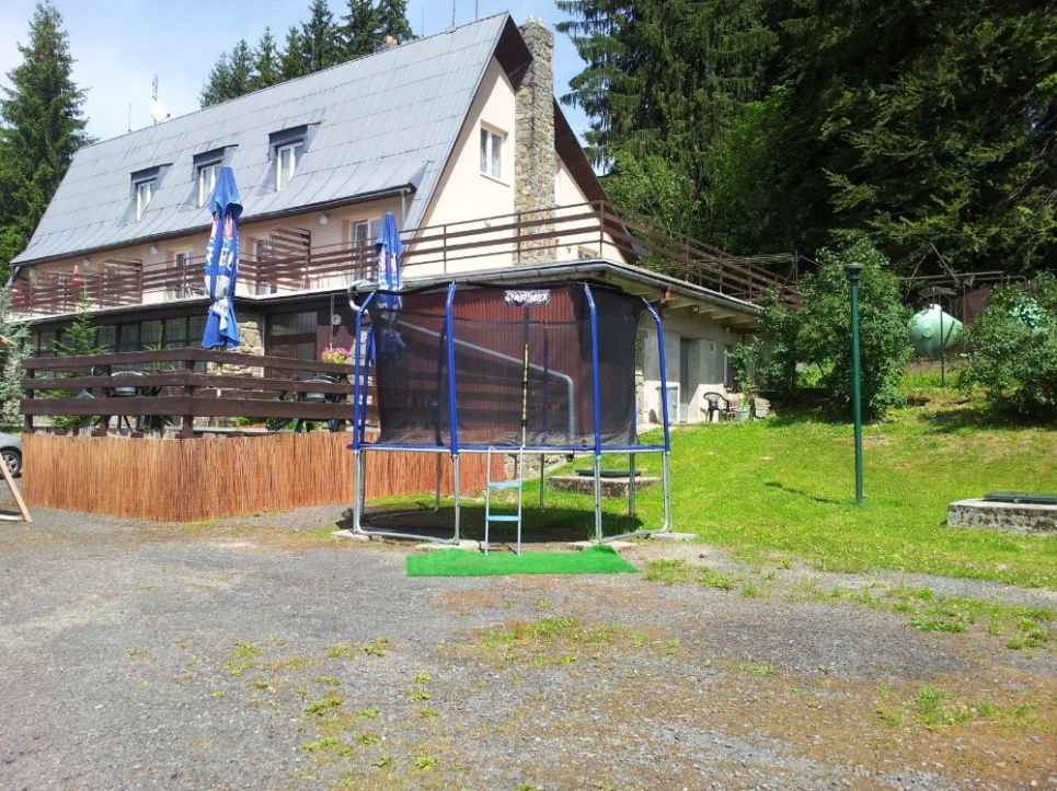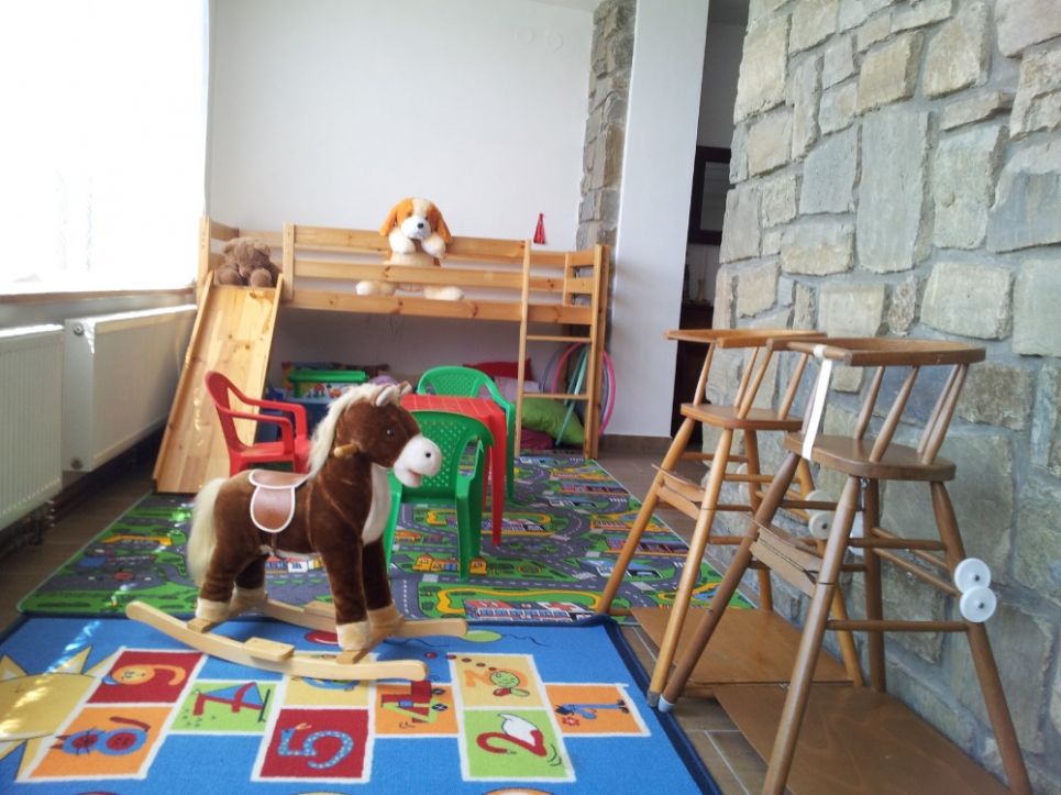 V přízemí penzionu je prostorná kuchyně, jídelna s prostorem pro odpočinek a relaxaci s krbem a velkou plazmovou TV. Součástí prostoru je také malý dětský koutek.